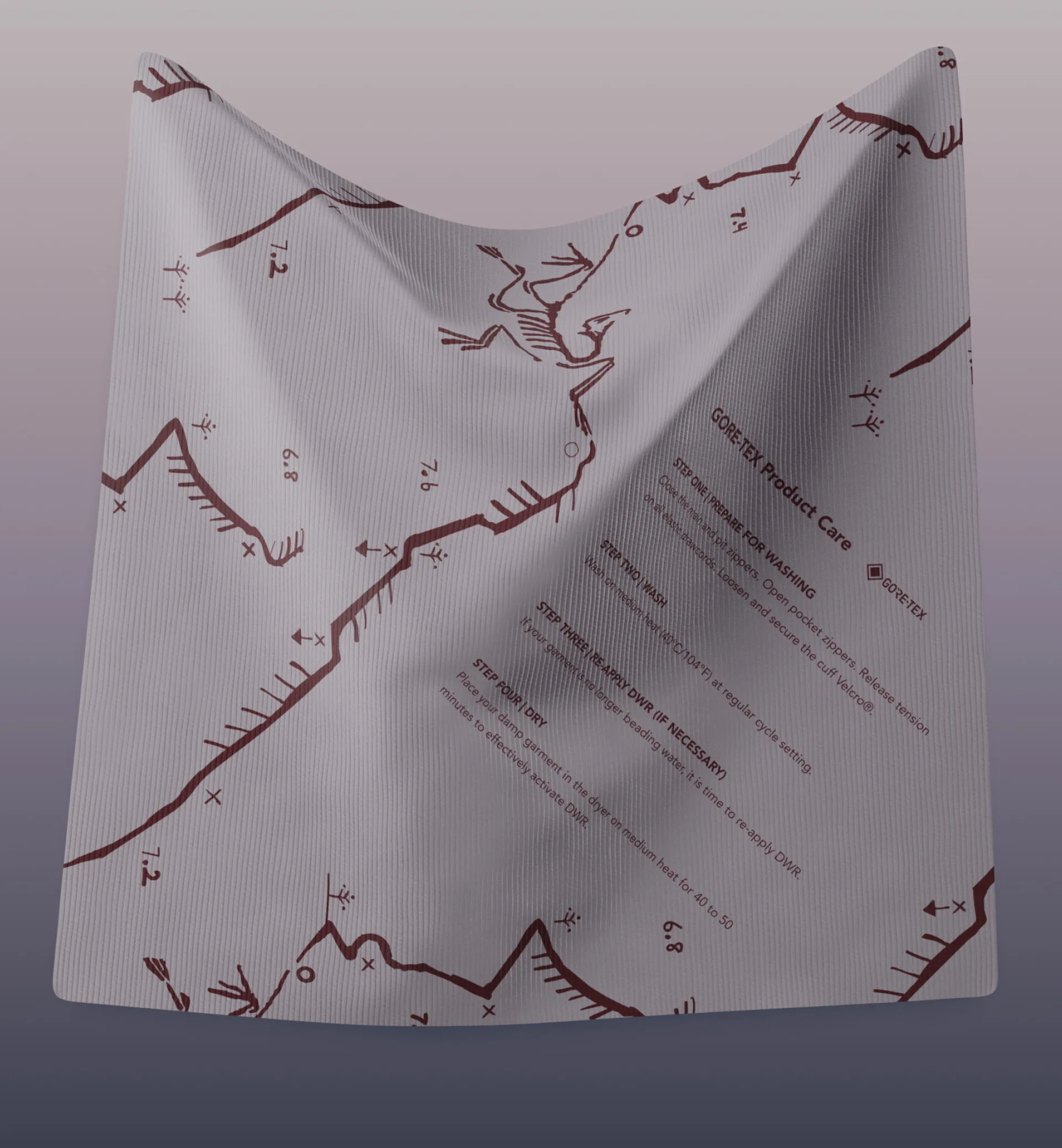 As a regularly used and washed garment for hikers, the Trail Bandana accessory act as physical reminders of product care. The front side uses hiking trail patterns related to international brand store locations to provide aspirational value alongside the functional value of the product. The backside is printed with product care instructions to guide users as they build out