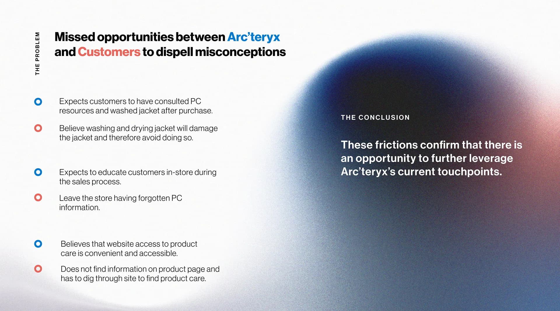 Conduct user research & ethnography to identify customer+client problems. Develop a proposal that uses UX & service design process to address and solve the problem. We worked with two Vancouver Arc'teryx branches, and the post-sales team at Arc'teryx HQ.